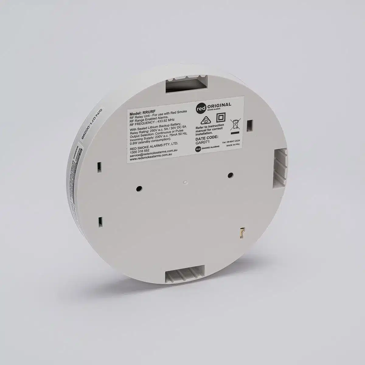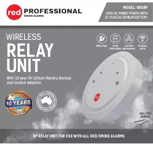 The RRURF RF Relay Unit is a versatile, stand-alone device designed to enhance the functionality of your smoke alarm system. Powered by a 240Vac mains supply, it features a 10-year 3V lithium battery backup for reliable operation of the RF receiver. Simply position the unit within RF range of your smoke alarm or place it next to an auxiliary device. It supports alarm and low battery signal notifications via RF or hard-wired SDI connections. Compatible with both Red Original and Red Professional Series smoke alarms, it seamlessly integrates with any interconnectable 240Vac or 10-year lithium battery-powered red smoke alarms. The unit also offers convenient conduit and duct entries for flexible installation.